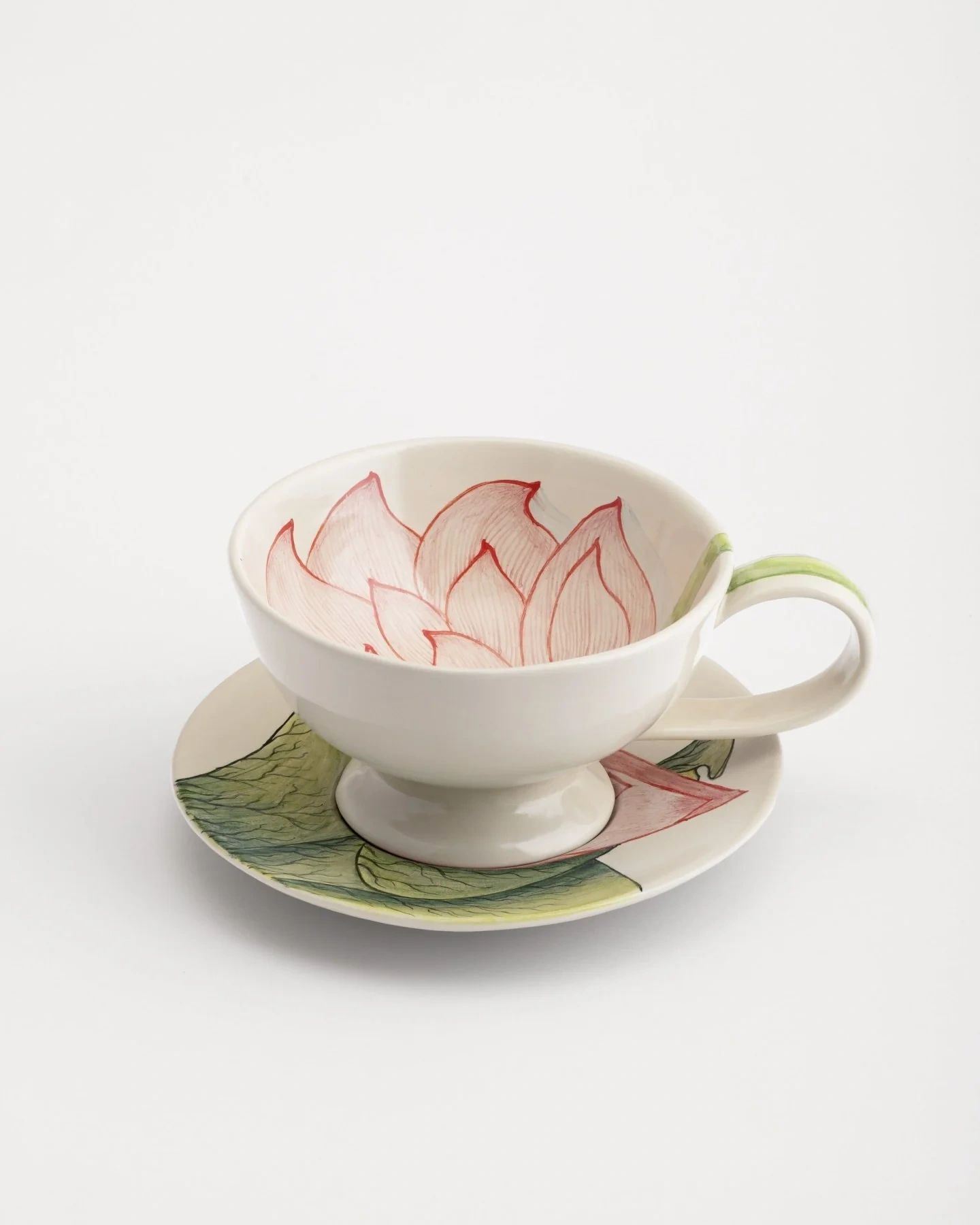 The Large Lotus Tea Cup and Saucer is a masterpiece by Erone and it will add the serene beauty to your tea rituals. This beautiful set has been painted with a lotus design using hands which makes a touch of beauty of nature to your cup. The elaborate red lotus flowers within the cup are in stark contrast to the green gentle and earthy hues of the cup and provide a relaxing artistic treat with each drink.