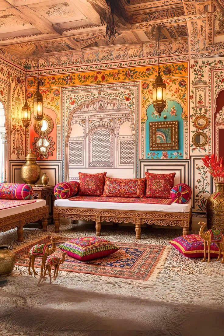 We believe in space design telling a story here at Erone. Rajasthani Inspired Sitting Area Decor is an impressive example of how one can incorporate the traditional nature into the modern setting without any problems. This interior will turn your house into a vibrant and comfortable getaway though luxurious fabrics, hand-made elements of furniture, and ethnic accessories.